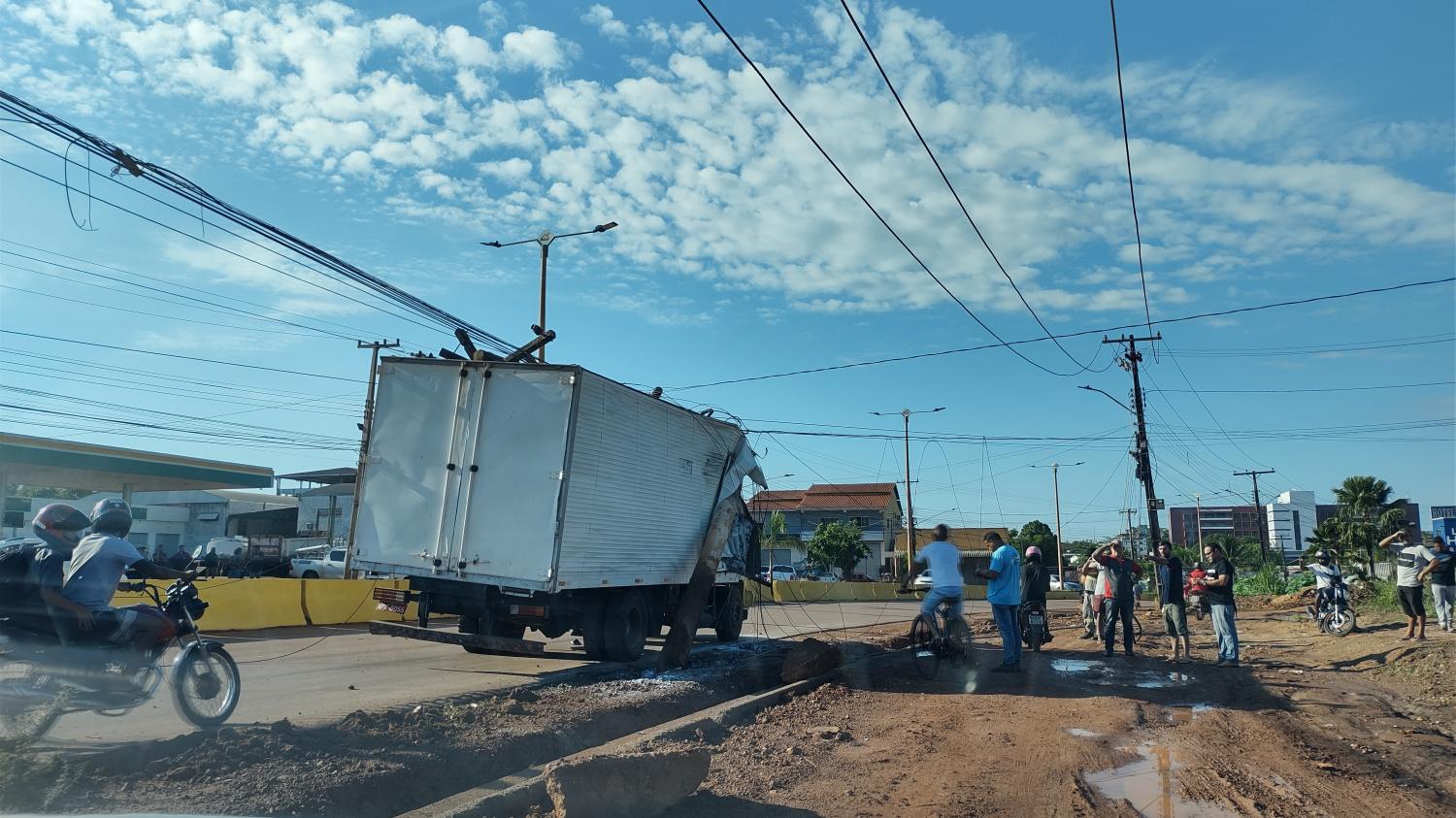 Pela manhã deste sábado 10/07, um caminhão de transporte do tipo baú, se envolveu em acidente chocando se com a fiação de energia na rodovia Transamazônica, perímetro urbano, nas proximidades da curva da morte. O choque foi tão forte que arrancou o poste do solo e a carroceria do veículo foi rasgada pelos cabos de energia.