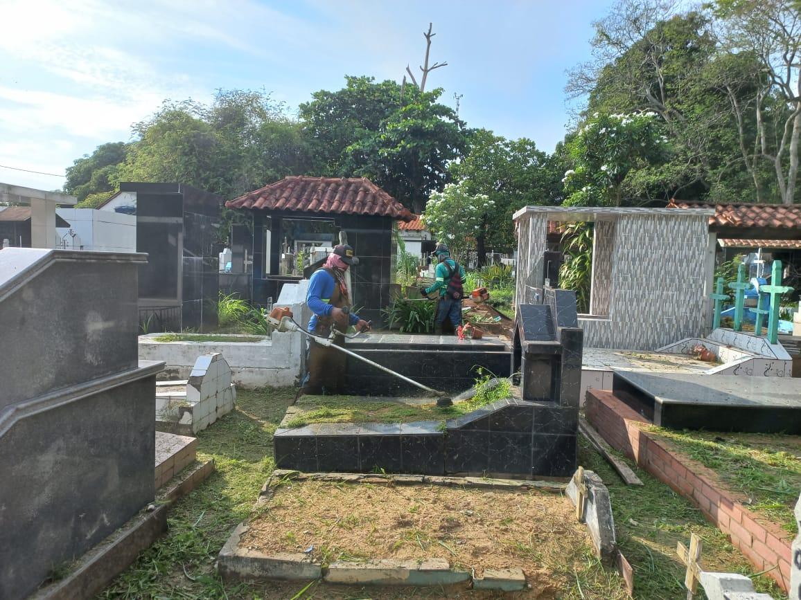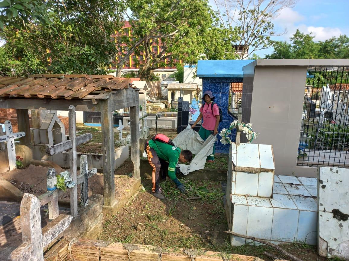 As equipes de limpeza iniciaram os serviços de roçagem, capinação, retirada de entulho e lixo nas alamedas e arredores de sepulturas ainda na semana passada, nos cemitérios São Francisco no km 06, e Santo Antônio, no Centro.