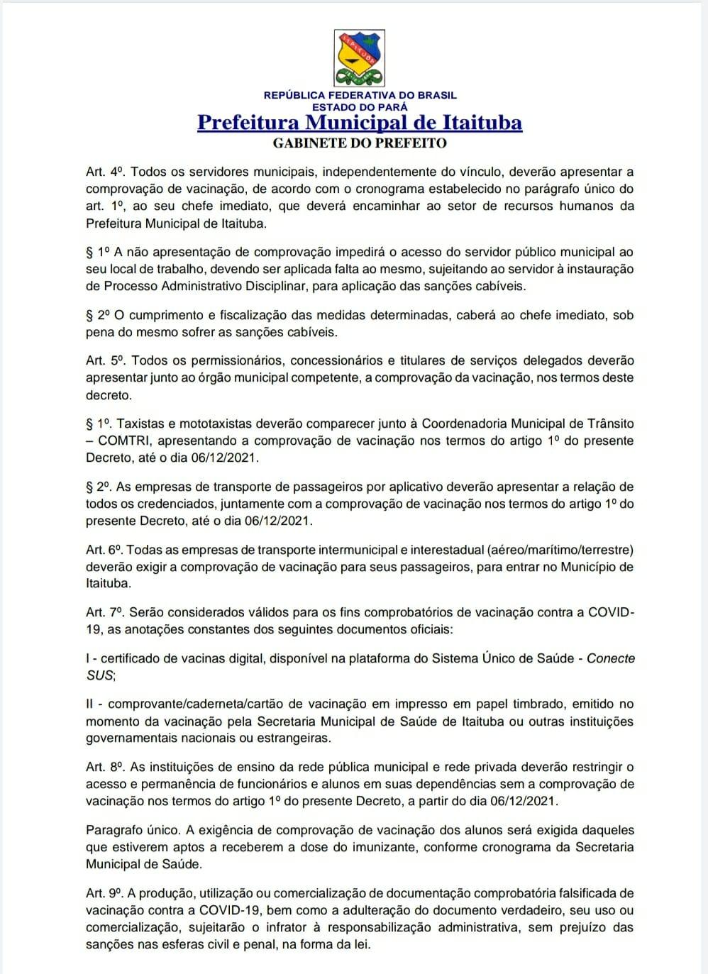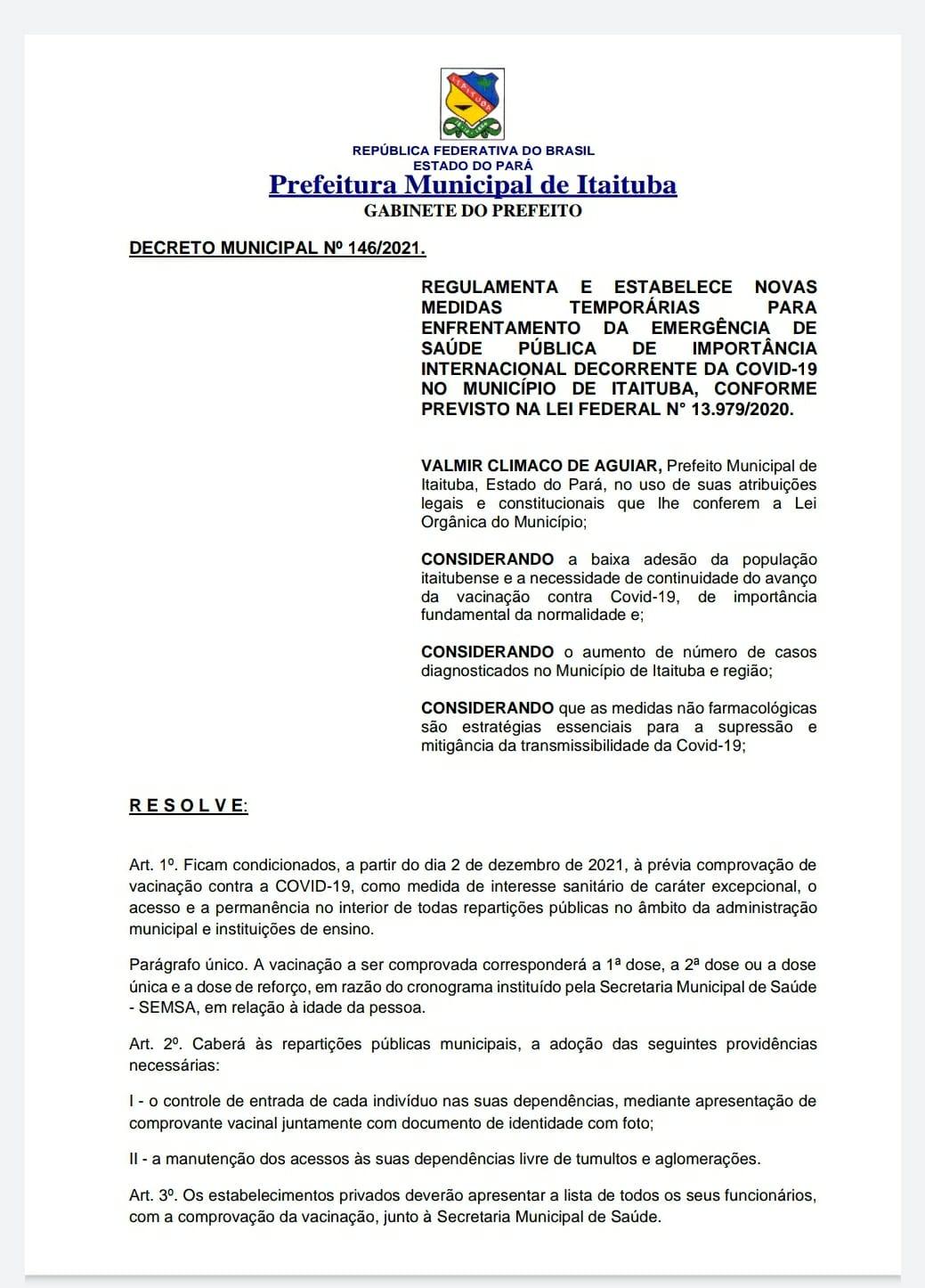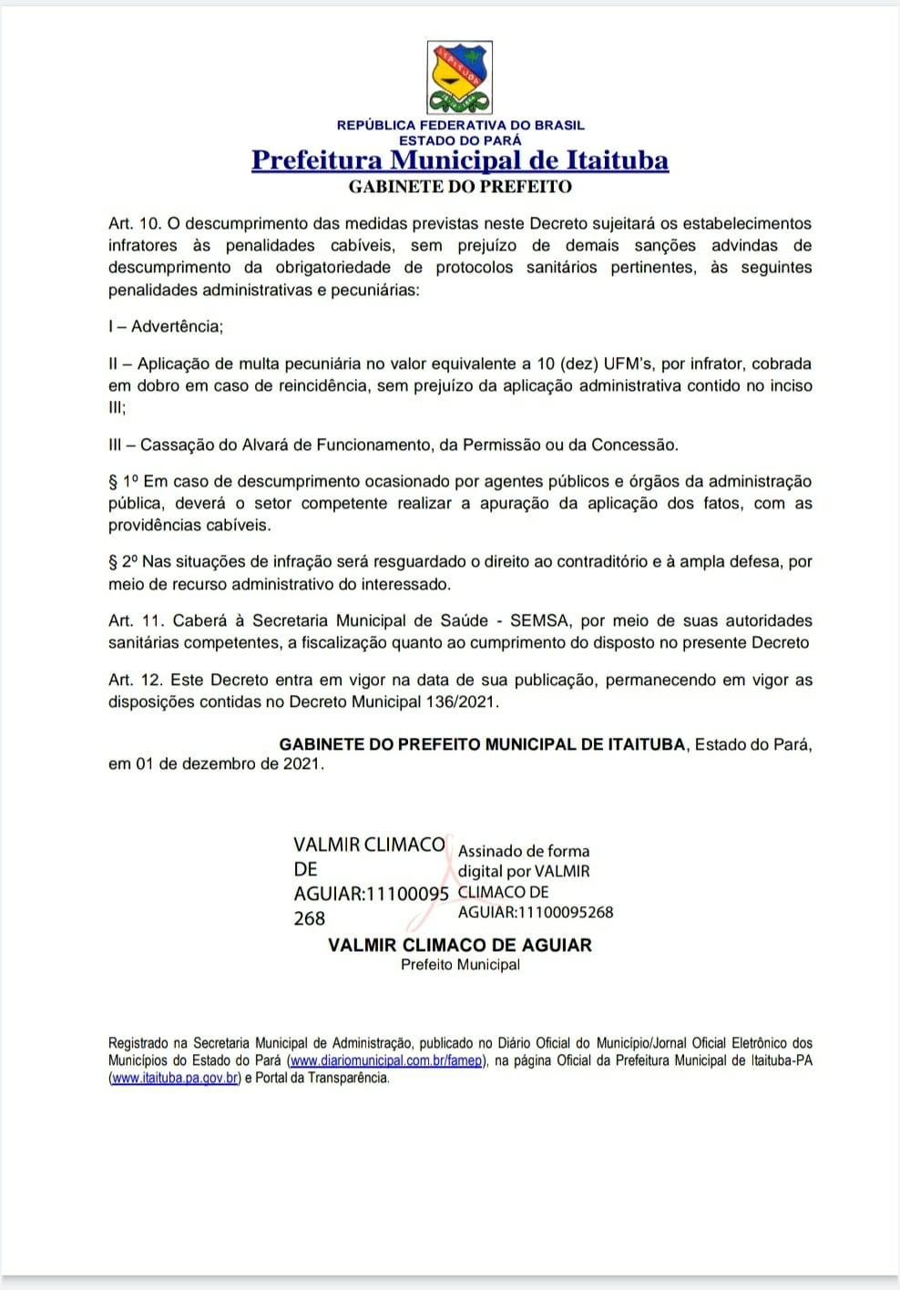 Na tarde dessa quarta-feira 01/12, Prefeito Valmir Climaco (MDB), e sua assessoria jurídica colocaram a público um novo decreto buscando endurecer e concientizar a população do município. O decreto n⁰ 146/2021, trás novas medidas que serão tomadas para fortalecer a prevenção da Covid-19 em Itaituba, sudoeste do Pará.