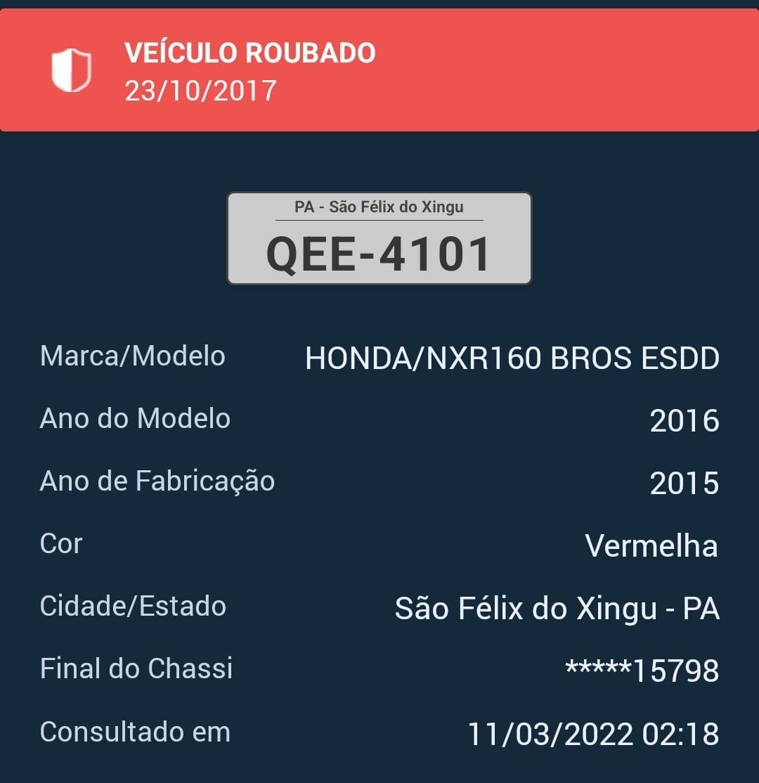 Nas fiscalizações, também é de praxe, averiguações na busca de veículos com registro de furto/roubo, drogas ou armas ilegais, e hoje sexta-feira (11), por volta de 02h, durante abordagem de Fiscalização de Trânsito na OPERAÇÃO TAPAJÓS no município de Itaituba Pará, agentes de fiscalização do Detran-PA, após minuciosa verificação dos elementos de identificação em uma motocicleta HONDA/BROS 160 VERMELHA, identificaram registro de FURTO/ROUBO.