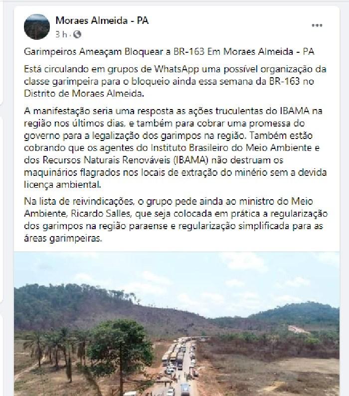 Conforme a nota que circula nas redes sociais, garimpeiros estão se articulando para fechar rodovia e diversos pontos entre Novo Progresso e Moraes Almeida. Segundo a nota, Garimpeiros pretendem iniciar uma interdição em protesto bloqueando trechos da rodovia BR 163 em alternativa para pressionar o governo a legalizar garimpos .